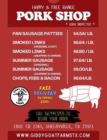At Giddy Goat Farms, TX we pride ourselves in raising healthy, happy pigs. All of our pigs have free reign of the farm. They are fed quality foods including a variety of swine feed, fruits, vegetables, grasses, acorns and treats. They have fresh water to drink plus ponds and creeks to swim and get muddy in. When I say we treat our pigs like kings and queens, we do! They are loved on and pampered. Giddy Goat Farms is truly hog heaven.